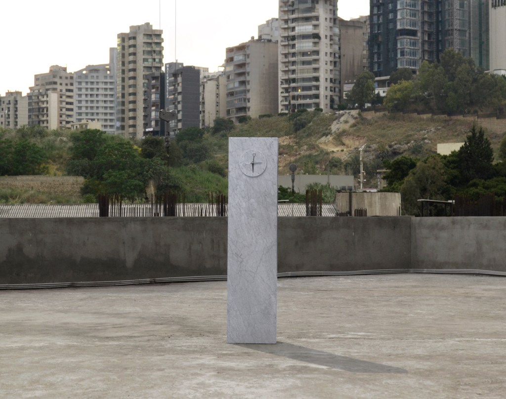 In the video, the clock stands on the rooftop of the exhibition space, with its shifting shadow marking the passage of time.