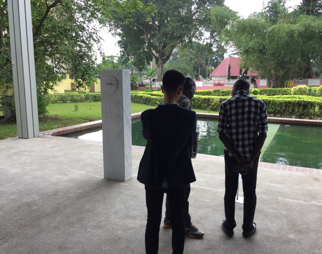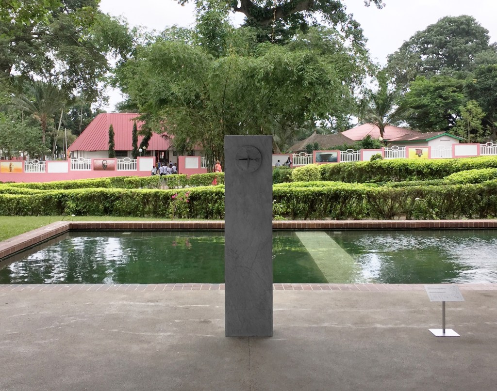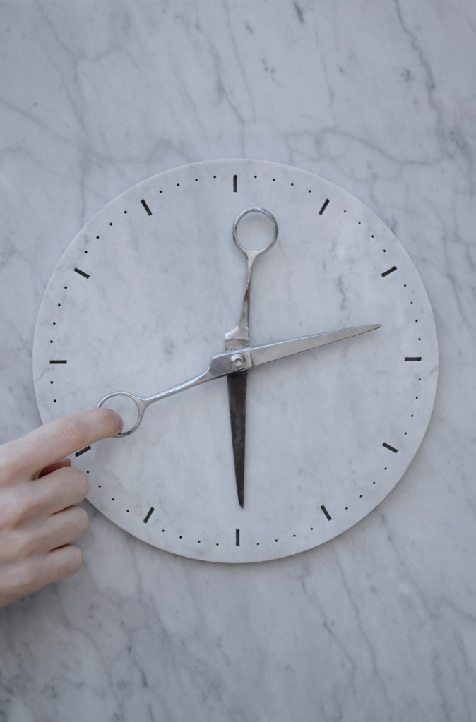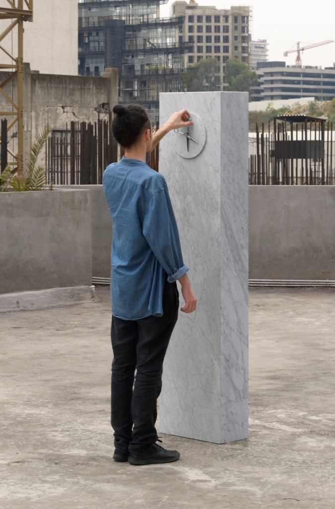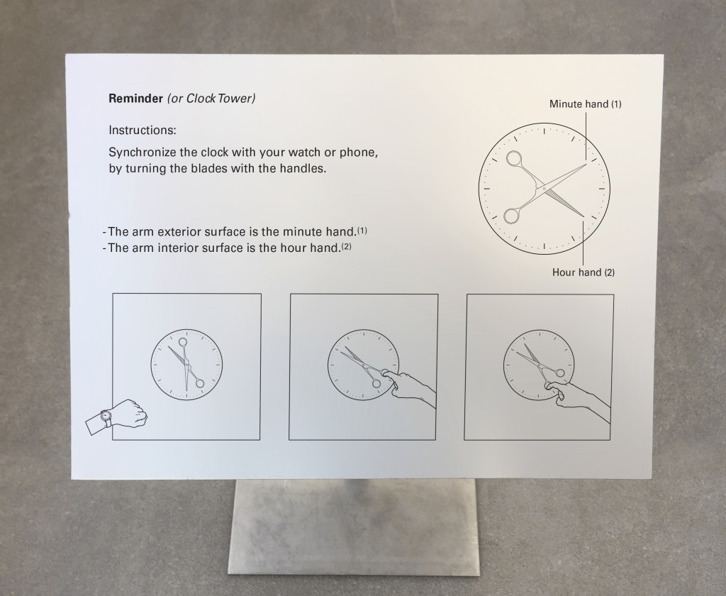 Reminder is a human-scale clock tower made of marble, with a pair of scissor blades in place of clock hands. Visitors are invited to synchronize the clock with their own watch by rotating the blades, guided by instructions placed alongside the sculpture.