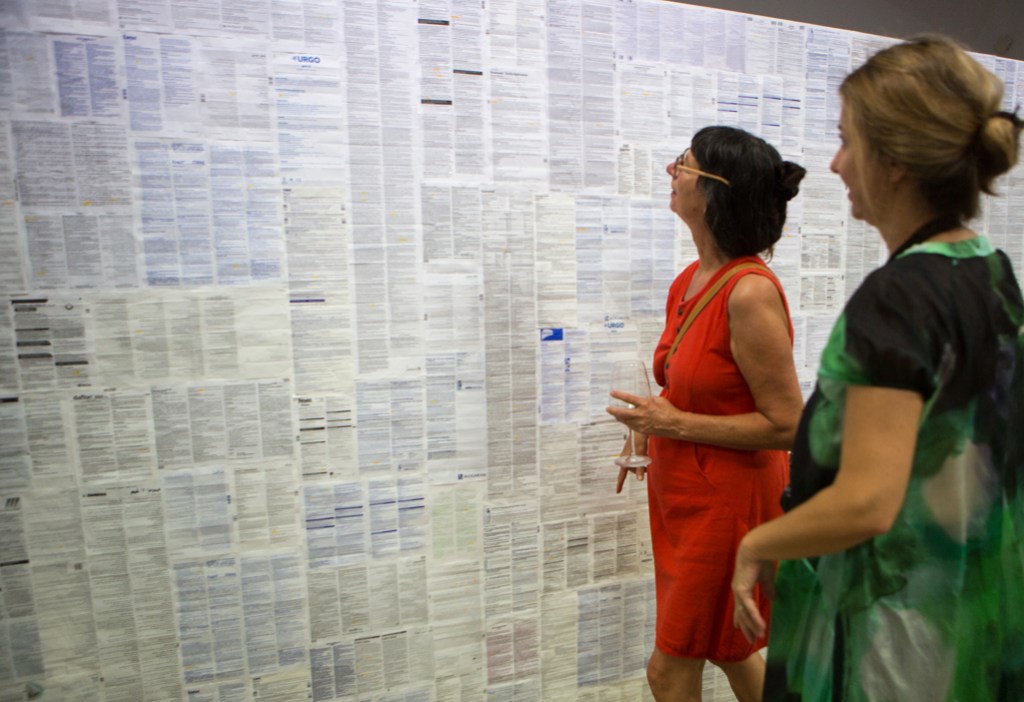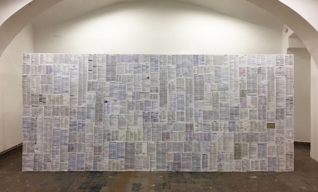 Medicine leaflets on constructed wall, 500 x 200 cm